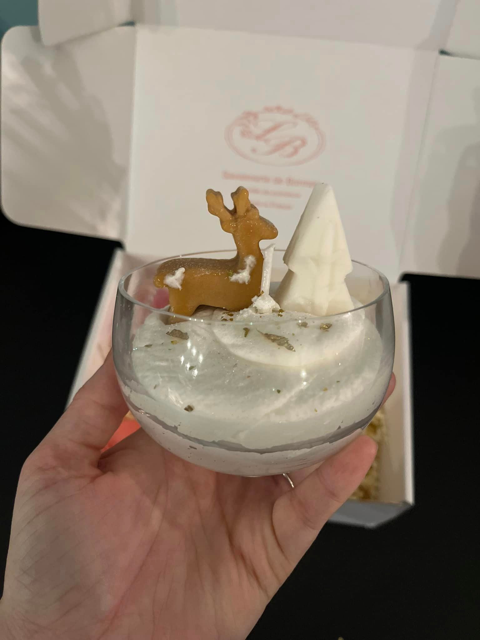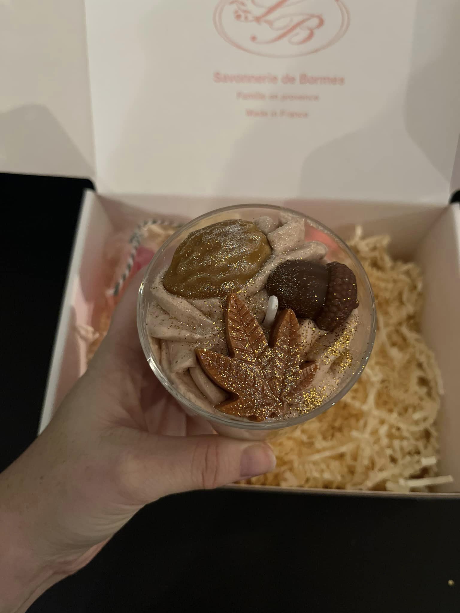 - coffret 3: savon en forme de sapin, savon macaron, grosse bougie ( choix entre : « coton », « vacances à la neige » verrine en verre cerf (+5€), « tombe la neige », « cerise », « pot Panetonne »)