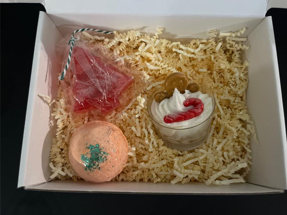 -coffret 6: savon en forme de sapin, boule de bain, macaron et grosse bougie ( choix entre : « coton », « vacances à la neige » verrine en verre cerf (+5€), « tombe la neige », « cerise », « pot Panetonne »)
